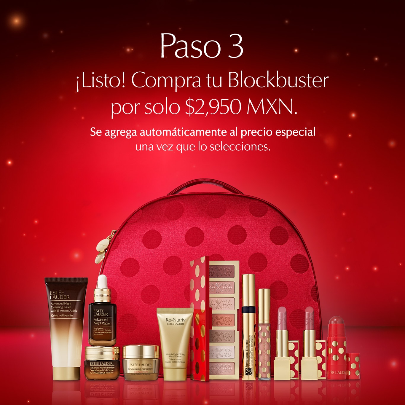 *Valido hasta el 1 de diciembre del 2025. Descuento en productos seleccionados y puede variar el porcentaje de descuento según el producto. Los obsequios pueden variar según la disponibilidad, revisa existencias en el carrito de compra al cumplir la mecánica de obtención. En caso de agotarse, se reemplazarán con otros de características similares en uso, resultado, calidad, cantidad, precio, etc. Imágenes de carácter ilustrativo. Promoción exclusiva online. Promoción exclusiva sólo en www.esteelauder.com.mx